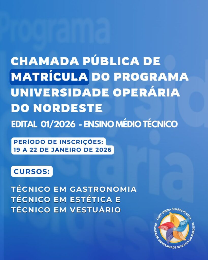 O CMEP Eneida Soares Pessoa abre matrículas para o Ensino Médio Técnico integrado à EJA, voltado a egressos do Programa Universidade Operária do Nordeste.